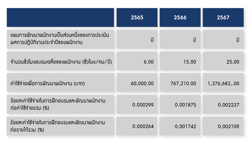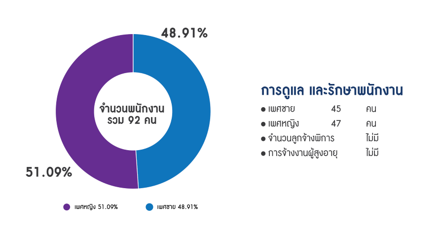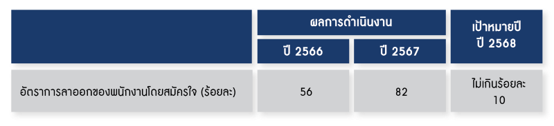 และการมีส่วนร่วมของพนักงานพร้อมทั้งพัฒนาศักยภาพและดูแลสวัสดิการของพนักงานอย่างครบวงจร นอกจากนี้ บริษัทมุ่งสร้างสภาพแวดล้อมการทำงานที่ปลอดภัย เอื้อต่อการพัฒนาตนเอง และส่งเสริมความเท่าเทียมในที่ทำงาน เพื่อให้พนักงานสามารถทำงานได้อย่างมีประสิทธิภาพและเติบโตไปพร้อมกับองค์กรอย่างยั่งยืน